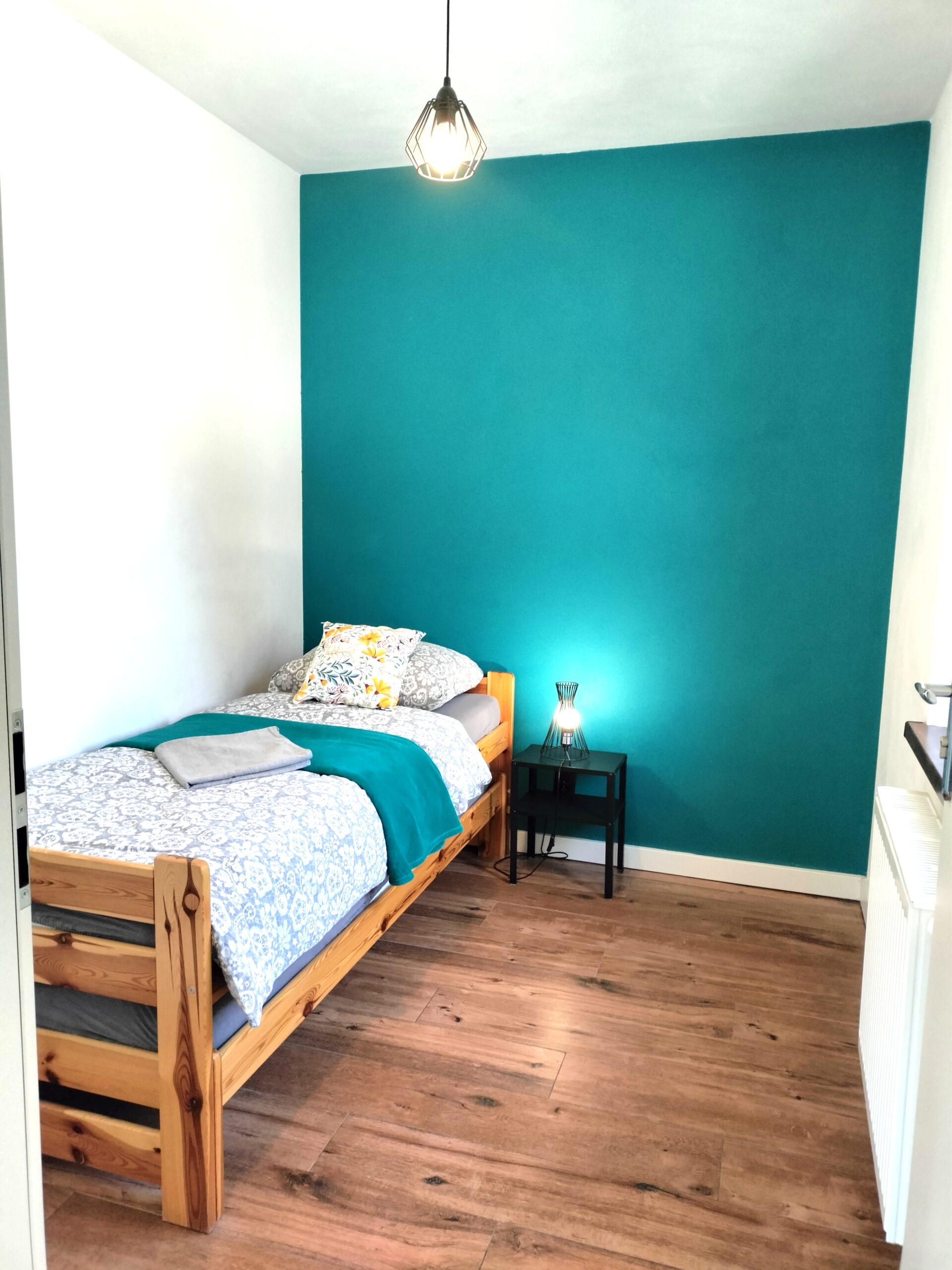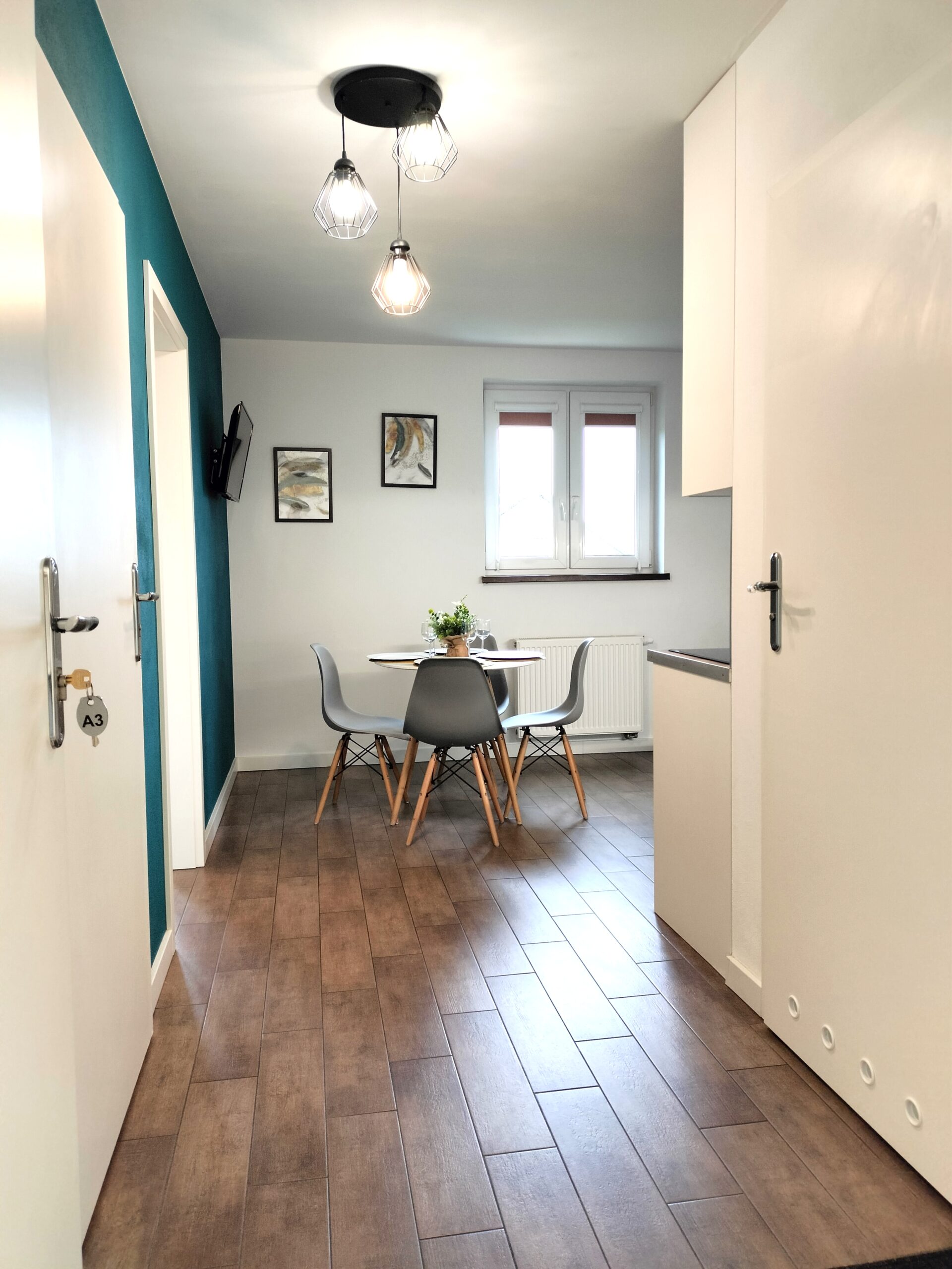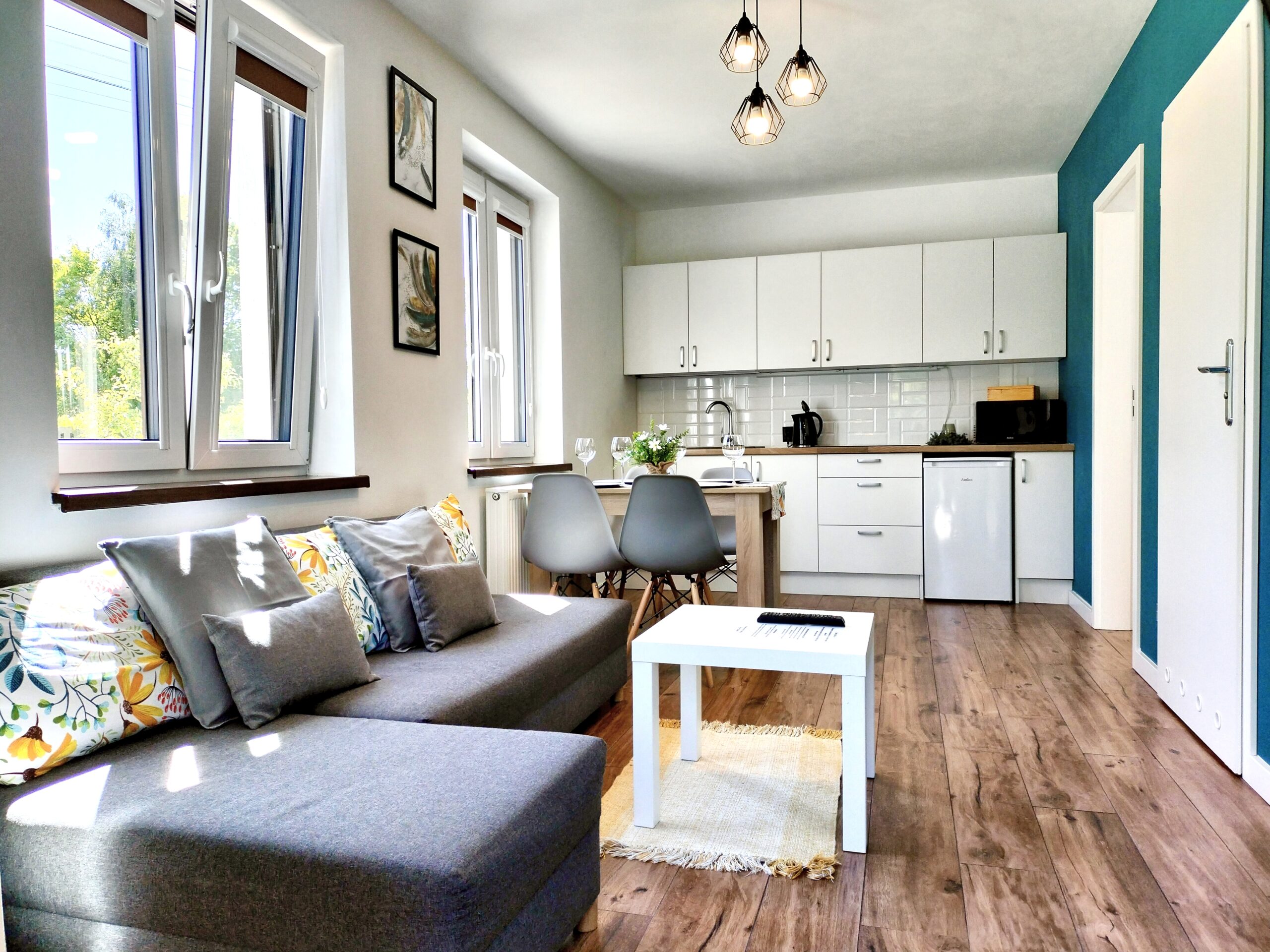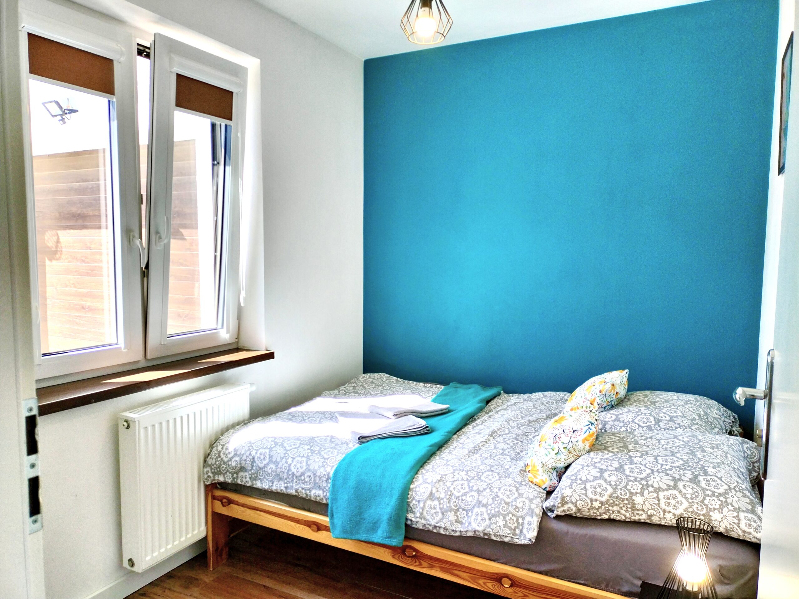 45 metrowy apartament znajduje się na parterze budynku, posiada osobne wejście oraz indywidualne miejsce parkingowe tuż przy apartamencie. Nie ma sąsiadów. Składa się z dwóch dwuosobowych sypialni (w pierwszej sypialni łóżko małżeńskie, w drugiej sypialni dwa łóżka pojedyncze) oraz salonu z dwuosobową kanapą z funkcję spania. W strefie dziennej znajduje się także stół jadalniany, TV oraz aneks kuchenny wyposażony w płytę indukcyjną, czajnik elektryczny, kawiarkę, zastawę stołową, kubki, szklanki, kufle, kieliszki, garnki, patelnie, przyprawy, kawę i herbatę. W łazience znajduje się kabina prysznicowa typu walk in, ręczniki oraz suszarka do włosów. W apartamencie znajdziecie także login oraz hasło do bezprzewodowego Internetu światłowodowego, rolety zaciemniające oraz moskitiery. Pomieści 6 osób.